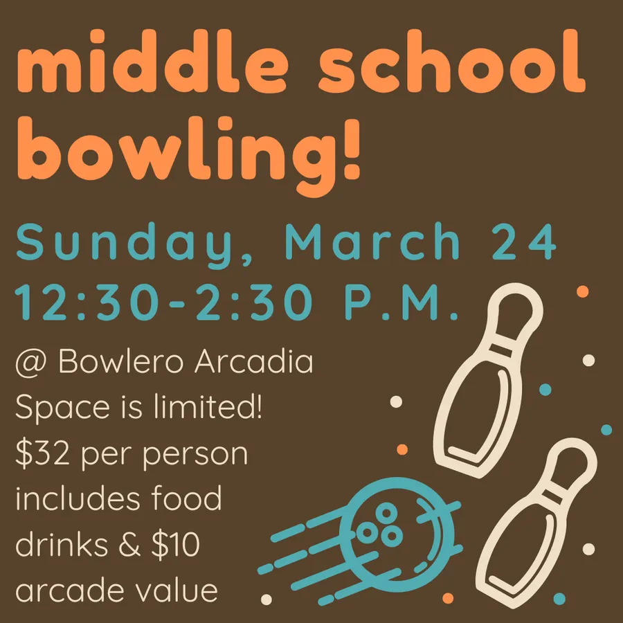 Middle School students (grades 6-8) are invited to join Natalie Davis for bowling and games at Bowlero Arcadia. Space is limited! $32 per person, includes food, drinks and a $10 arcade voucher.